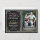 Cartão de Natal bonito, estilo chalkboard, com tipografia estilo chalkboard, flocos de neve, flores de Natal e coroa. Mostre as suas belas fotos, dentro, o giz bonito que desenhou a fronteira.