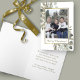 Este cartão de feriado é festivo, único e bonito. Ele apresenta um design maravilhoso com sua foto em um quadro de folha de ouro falso rodeado por galhos pintados manualmente de pinheiro d'água e folhas de eucalipto em tons de verde-sábio e ouro. A legenda editável diz Feliz Natal, e há espaço para uma dentro de saudação e assinatura. Maneira perfeita de enviar saudações nesta temporada de festas.