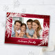 Este cartão fotográfico de Natal é acentuado com galhos verdes que aparecem em branco sobre um fundo vermelho escuro pintado. O design é acentuado com sutil neve caindo.