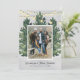 Este festivo "Desejamos-lhe um Feliz Natal!" design de cartão com fotos de Natal apresenta uma rústica cena de inverno chique de uma fazenda de árvore de Natal que enquadra um retrato familiar favorito. Inclui um fundo de cinza nevado com luzes cintilantes suspensas e pinheiros verdes de cor d'água cortados recentemente. Personalize com a sua escolha de cumprimentos, o sobrenome da sua família e o ano. Um padrão de coordenação de pequenos pinheiros e uma colagem fotográfica de 4 fotos quadradas se veste na parte de trás da carta.