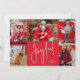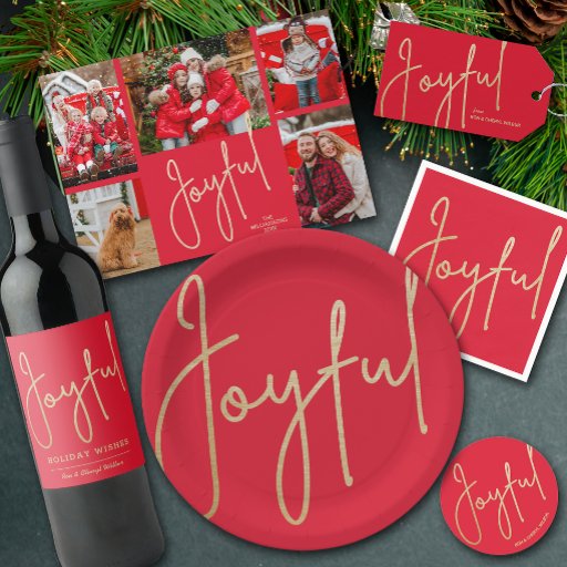 Os cartões de natal de Natal com várias fotos apresentam seus nomes e a palavra Joyful em letras de música em um único plano de fundo vermelho. Basta carregar suas 5 fotos favoritas e adicionar sua personalização no verso. Selecione Alta definição para melhor qualidade de foto. O Serviço de Design ao Vivo pode ajudá-lo com o layout design das suas fotos, se necessário.