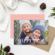 O cartão com fotos de feriado moderno de ano novo apresenta a sua foto horizontal favorita com a cobertura de texto "Happy 2024!" design com texto personalizado e borda de formatos de confetti. Personalize com uma mensagem personalizada e seus nomes ou nome da família. A parte traseira da placa apresenta uma cor de fundo rosa dourada / rosa impressa (pode ser modificada) com o padrão de configuração de coordenação.