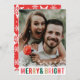 Cartão de saudação colorido de Natal "Feliz e Brilho" para design de floco de neve bonito para casais. Para personalizar a parte frontal da placa - carregue sua fotografia vertical. O verso está num floco de neve vermelho que coordena com letras coloridas que diz: "Que seus dias sejam Felizes e Brilhantes nesta temporada de festas." Personalize com seus nomes.