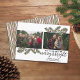 Use duas fotos horizontais com o assunto centrado. Faça uma saudação de Natal feliz e única, com galhos de pinheiro brancos na frente e um padrão de riscas desenhadas à mão no verso. Se precisar mover alguma coisa, clique no botão personalizar para fazer alterações. Crédito Fotográfico: Fotografia © Storytree Studios, Stanford, CA