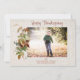 Design de colheita rústica e colorida, com modelo de foto de solteiro em fundo de canvas de tecido rústico com spray de ouro, laranja e vermelho, folhas e bagas de outono, com saudação de Feliz Ação de Graças em roteiro de caligrafia personalizado e campos de texto editáveis. A parte traseira apresenta um padrão tartano complementar em coordenação das cores de queda.