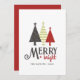 Cartão elegante, único, simples, preto branco e Feliz vermelha e moderno Brilhante de Natal, com pinheiros coloridos e foto atrás.