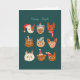 Cartão de saudação de Natal bonito com ilustração desenhada manualmente de vários gatos vestindo fantasias de férias. O texto diz "meowy + bright".