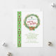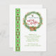 Um cartão de Natal com uma coroa aquática. Agulhas de pinheiros verdes, cones de pinho e bagas decorativas constituem esta coroa festiva. Dentro a coroa são alguns ornamentos decorativos e as palavras" podem ser Feliz e Brilho. Escrito em uma fonte vermelha da moda. Um padrão verde e vermelho com quadrados brancos ao longo da fronteira.