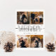 Cartão de férias elegante e moderno, com um texto tipográfico que diz "pacífica, divertida, feliz" com 4 fotos quadradas. Adicione outra foto no verso juntamente com sua mensagem. O fundo é branco.