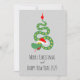 Cartão engraçado e bonito para a próxima temporada de férias de inverno. São dois em um! Você pode enviar este Cartão aos seus amigos e entes queridos para desejarem Feliz Natal e Feliz ano novo ao mesmo tempo. Apresenta uma ilustração de desenho animado do Cobra que veste o Santa Hat e se vangloria na forma Árvore de Natal. Por que Cobra? Porque 2025 será o Ano do Cobra de Madeira no Ciclo Zodiac Lunar Chinês. Não hesite em me contactar via Zazzle se precisar de ajuda para personalizar o texto do cartão.