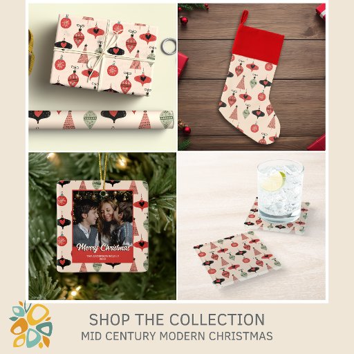 Envie cartões de natal incríveis com nosso Cartão de Natal Moderno do século Médio. Apresentando designs festivos em vermelho, rosa, verde e preto, este cartão capta o encanto dos motivos da Era Atômica. Inclui uma mensagem quente editável desejando alegria, amor e risos para o feriado. Perfeito por compartilhar alegria festiva com entes queridos.