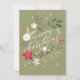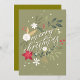 Um suave zoom em um cartão de Natal lindamente projetado, apresentando um arranjo exuberante de flores e folhagens festivas. As cores vibrantes vermelho, branco e verde criam uma atmosfera quente enquanto a câmera lentamente percorre os detalhes intrincados dos elementos florais. A elegante escrita "Feliz Natal" se destaca contra o fundo verde suave, convidando um espírito natalino aconchegante. A iluminação suave e difusa realça as texturas do cartão, criando um clima sereno e alegre, perfeito para a época.