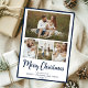 Este belo cartão de Natal de colagem de fotos com 4 fotos, Feliz Natal em uma fonte moderna de escrita de pincel, um sentimento personalizável, seus nomes e o ano seriam perfeitos para enviar para seus amigos e família. Todos adorarão tirar novas fotos da sua linda família. As fontes são modernas e limpas em azul marinho.