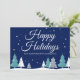 Belo céu azul da meia-noite com árvores de abeto de Natal decoram este bonito e personalizado cartão de Feliz Feriados corporativo. A neve encosta a adorável floresta e os flocos de neve brancos a borrifar no ar noturno. Personalize esses cartões de visitas de sua empresa.