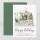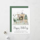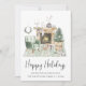 Cartão de Natal inspirado em Boho, com a ilustração aquática de um confortável sábio, verde, interior, decorado para as festas com coroa, lareira, rena, árvore de Natal, velas e gnomos. "Felizes Feriados" está escrito em um roteiro moderno da na moda. Adicione seu nome e o ano em uma simples tipografia moderna.