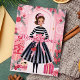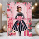 Envie cartões de natal na moda com este cartão chic com uma boneca elegante vestida em um belo traje de férias. Envolvido por decorações e presentes festivos, esta carta é perfeita para amantes da moda que apreciam uma design de Natal única e glamourosa.
