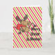 Bonito design de Natal apresenta um gráfico de um alce de desenho animado vestindo um cachecol vermelho para o Natal. O alce está levantando a perna enquanto caminha sobre o texto em uma fonte de cinza escura que diz Cristo Feliz-Moose! como uma peça de palavras para o Natal. O fundo é constituído por listras vermelhas, brancas e verdes para aquele toque festivo de Natal adicionado. A dentro do cartão tem um texto preto que diz Desejando a você um alce de Cristo Feliz e um novo e feliz querido. Seus amigos e família vão adorar este cartão de Natal bonito e engraçado.