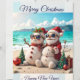 Um cartão de Natal caprichoso com dois bonecos de neve alegres em uma praia ensolarada. Um deles usa um chapéu do Papai Noel e óculos de sol, enquanto o outro tem acessórios festivos. Eles sentam lado a lado, cercados por pequenas árvores de Natal e enfeites, com uma caixa de presente.