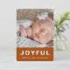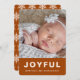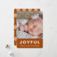 Esta saudação de fotos de Natal moderna e chique apresenta um grande tipo alegre em um elegante fundo laranja queimado. Há um impressão festivo floco de neve na parte de trás deste cartão de tendências.