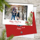 Esta design apresenta o Feliz Natal, bonitinho, vermelho-d-água, bagas ocas rústicas, feriados de Natal, 2 fotos da família, pinus botânicos ramificados, típica tipografia branca minimalista simples, moderna letra de caligrafia de na moda, verde elegante, folhagem de inverno, cartões de natal com fotos de férias, moderna e elegante letra simples, guião de caligrafia moderna, alegria feliz fonte de script de caligrafia