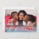 O cartão com fotos Holiday apresenta um design de sobreposição de script de caligrafia manuscrito vermelho "Feliz Natal" com texto serif personalizado com o ano e sua família / nome. A parte traseira da placa inclui faixas horizontais brancas abstrato com fundo vermelho.