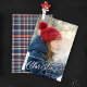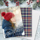 Este design apresenta uma fotografia clássica de Natal Feliz, com um roteiro de caligrafia em na moda, um roteiro de prata para fotos da família tradicional, uma classe mínima minimalista simples, com um modelo de 1 layout de foto, um cartão de feriado horizontal de cheio sangrado, com tipografia clássica de caligrafia de rico, um roteiro de caligrafia prateada com padrão de xadrez azul e vermelho de Marinho. cartão com fotos ic