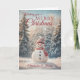 Um belo cartão de natal festivo Holiday Season Snowman constituído por uma cena de neve de inverno com um boneco de neve sorridente vestindo um chapéu de calor e um cachecol cercado por árvores cobertas de neve Todo o texto pode ser personalizado e depois personalizado com o nome e a mensagem de dentro