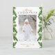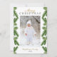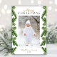 Belo cartão de férias com galhos verdes e nevados e sua foto de feriado favorita. Um cartão simples e elegante perfeito para a família e os amigos.