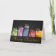 Um cartão de Natal colorido com uma fileira de presentes brilhantemente coloridos com fitas bonito, com a mensagem Feliz Natal, em ouro.