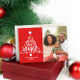 Cartão de árvore de Natal vermelho e branco moderno com a mensagem "Feliz e brilhante", uma foto, o nome da família ou texto personalizado, o ano atual e uma mensagem personalizada no verso.