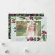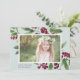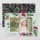 Mande cartões de natal para amigos e família em estilo chic com nossos cartões com fotos elegantes. Os prigos graciosos da folhagem de cor d'água pintada e os bagos vermelhos profundos enquadram sua foto, com sua saudação personalizada (mostrada com "Feliz Natal") e seu(s) nome(s) familiar(s) preso(s) no canto inferior esquerdo. Cartões ao contrário revelam um padrão botânico de inverno correspondente.