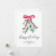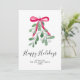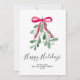Este cartão de Natal é decorado com visco verde em aquarela, uma fita vermelha e tipografia de roteiro elegante que diz "Felizes Festas"