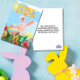 Uma carta de Páscoa tão bonita e adorável. Uma design gráfica colorida de um coelho segurando-se no seu ovo de Páscoa, sentado na grama cercado por flores coloridas e ovos decorativos de Páscoa.