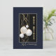 Um sofisticado cartão de boas-vindas Feliz Feriados com fitas e ornamentos brancos e dourados pendurados em um fundo preto e azul para que você compartilhe a alegria da época festiva. Personalize seus detalhes nas informações fornecidas abaixo da imagem.