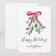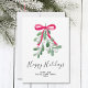 Este cartão de férias é decorado com viscera verde em aquarela, uma fita vermelha e tipografia de roteiro elegante que diz "Féérias Felizes"