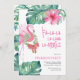 Os convites tropicais engraçados de Natal apresentam um flamingo cor-de-rosa-d'água com folhas de palma de monstera. As palavras Fa-la-la-la-la-la-la-la-la-la-mingle são colocadas em letras divertidas. Uma escolha bonita para a festa de pinkmas na praia da Flórida. Arte e design de aquarela únicas de Victoria Grigaliunas de Do Tell A Belle.