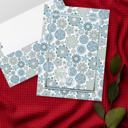 Estilo clássico contemporâneo Escandinavo Natal época festiva azul e begre flocos de neve e cristais de gelo mandala em um fundo branco nítido. Com espaço para personalizar ou personalizar com uma fotografia e o texto na frente, o nome da família (ou nomes individuais) e uma mensagem de saudação de estação personalizável no verso do cartão. Este motivo está disponível em etiquetas de endereço de retorno, papel de embalagem e de tecido, etiquetas de presentes, bolsas e caixas de favor, adesivos de selo de envelope, fitas, cadernos, ligantes, papelaria e envelopes.