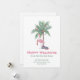 Flamingo de Natal com chapéu de Papai Noel e palmeira decorada. Feliz Natal da nossa nova casa para o Natal. O modelo está configurado para que você possa adicionar os detalhes da sua nova morada e manter contato com amigos e familiares durante a temporada de festas.