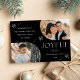 Deseje aos entes queridos uma feliz temporada de festas enviando-lhes um cartão de festas de tendências projetado por Late Bloom Paperie! O cartão de feriado exclusivo apresenta duas dentro de fotos de um quadro preto horizontal de fotos. "Joyful" é exibido em letras brancas modernas, acentuadas por flocos de neve desenhados à mão. Personalize a frente do Cartões de foto de Natal adicionando uma mensagem, um nome e um ano personalizados. A parte traseira do cartão de feriado multifoto exibe um padrão preto de floco de neve.