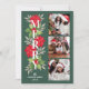 Este moderno cartão de Natal para tipografia floral apresenta uma colagem de 3 fotos na frente e 1 foto horizontal bônus no verso. A elegante design de tipografia inclui um design floral de inverno e verde-aquarela com uma camada simples e moderna de texto "Feliz". Inclui folhas e bagas sagradas, flores de poinsettia e ramos de folhas. Personalize o texto personalizado com o sobrenome da sua família, o ano e uma mensagem de feriado personalizada no verso do cartão. Escuro coberto de fundo verde com cores vermelha, verde e branca.