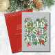 A palavra Natal entre as folhas e as bagas de inverno aparece na frente desses cartões de natal e sua saudação personalizada nas costas. Selecione Matte para o papel mais pesado e alta definição para melhor qualidade de impressão.