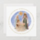Uma bela cena pintada de Natividade, com Mary, José e Jesus bebê em um mangueiro, e a letra do primeiro verso de Away In A Manger circulou completamente em torno da figura em ouro sobre um fundo branco fresco e um formato quadrado para um sentimento contemporâneo. Nas costas, personalize facilmente com suas saudações e nomes.