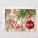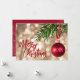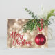 Um ornamento de árvore de Natal vermelha contra luzes desfocadas douradas e Feliz Natal na frente, seu cartões de natal pessoal está nas costas. Selecione Matte para o papel mais pesado e alta definição para melhor qualidade de impressão.