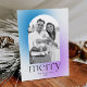 Cartão de férias único e moderno com sua foto emoldurada por um quadro de arco de gradiente azul e roxo. A "Feliz" é exibida em caracteres simples de cinza cardíaca com o nome da sua família e o ano mostrados abaixo. A placa de feriado gradiente reverte para exibir uma foto adicional com espaço para sua mensagem personalizada.