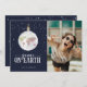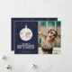 Paz na Terra: enfeite mundial de aquarela, cartão com fotos de feriado azul. Cartões, sotaques de neve em queda, ornamento do globo de aquarela e inscrições festivas. O Modelo fornece linhas de texto para o seu nome de família na frente com linhas para a sua mensagem, nomes e ano atrás.