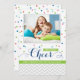 O design de cartão de animação festivo e na moda apresenta a sua foto favorita emoldurada por um confete brilhante e colorido e listras de chevron. Personalize com sua foto e texto personalizado. Cores: branco, cinza clara, marinho azul, verde limão, rosa claro, azul turquesa e vermelho-papoila.