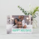 Belo cartão fotográfico de feriado com um banner na moda, simples, moderno e minimalista "Felizes Feriados" em divertido texto verde brilhante e festivo sobre um fundo de cobertura semitransparente. Essa versátil carta pode ser personalizada com sua própria fotografia, seu nome de família e seu ano para fazer um cartão verdadeiramente único e personalizado para a temporada de feriados. O cartão mostra uma imagem exemplar de uma jovem família de moentes de quatro, a fazer uma selfie numa cama numa casa moderna. Esta imagem foi concebida como um marcador de posição para ser substituída pela sua fotografia ou imagem de família favorita.