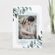 Placas de cartões de natal elegantes com sua foto vertical favorita na frente, emolduradas por uma borda de cor azul-clara e gelada. Folhas e folhagem verdes e azuis adornam as bordas do cartão de Natal único. Personalize a frente do cartão adicionando uma saudação personalizada (mostrada com "Feliz Natal"), seu nome e o ano em letras azuis escuras. A dentro do cartão de feriado dobrado apresenta a mensagem personalizada exibida em texto azul escuro. O design coordena-se com a nossa coleção de cartões de Natal da Folhagem de inverno.