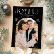 Deseje aos entes queridos uma feliz temporada de festas enviando-lhes um cartão de festas de tendências projetado por Late Bloom Paperie! A placa de feriado exclusiva apresenta a sua dentro de foto de um quadro de fotos em arco preto. "Joyful" aparece no topo em letras brancas modernas, acentuadas por flocos de neve desenhados à mão. Personalize a frente do Cartões de foto de Natal adicionando seu nome e o ano. A parte de trás do cartão de feriado fotográfico mostra um padrão preto de floco de neve.