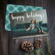 Use uma foto horizontal com o assunto, de preferência no meio. Faça uma saudação de Natal feliz única e moderna com um padrão de xadrez geométrica no verso. Se precisar mover alguma coisa, clique no botão personalizar para fazer alterações.